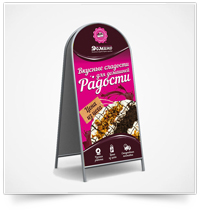 Штендер. Мобильный штендер — эффективный вид наружной рекламы. Это небольшая выносная конструкция с одной или двумя плоскостями для изображений. Надежная опора обеспечивает устойчивость к внешним воздействиям, давая возможность прохожим оценить представленную информацию и принять решение о посещении указанного объекта.